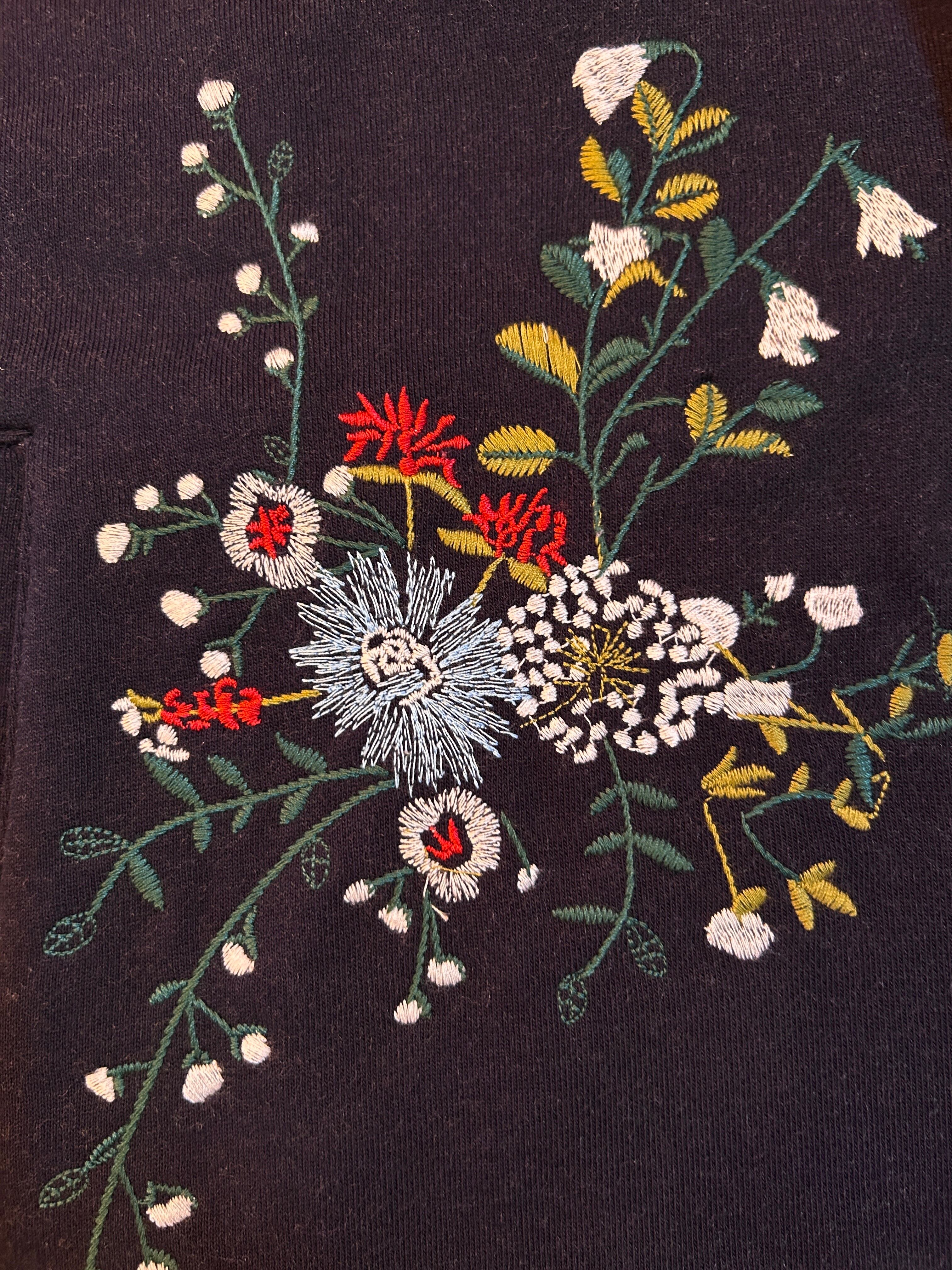 刺繍は、花が風に舞いながら咲き誇るようなデザイン。