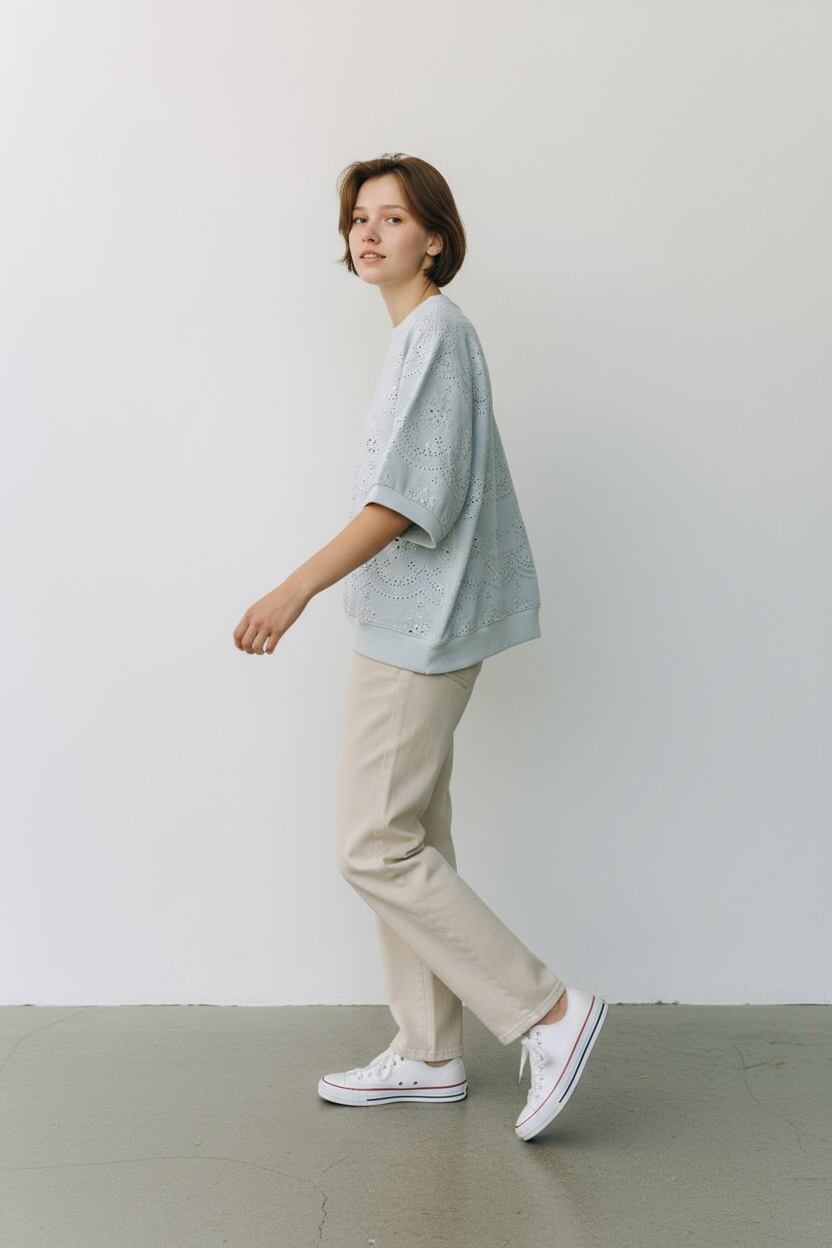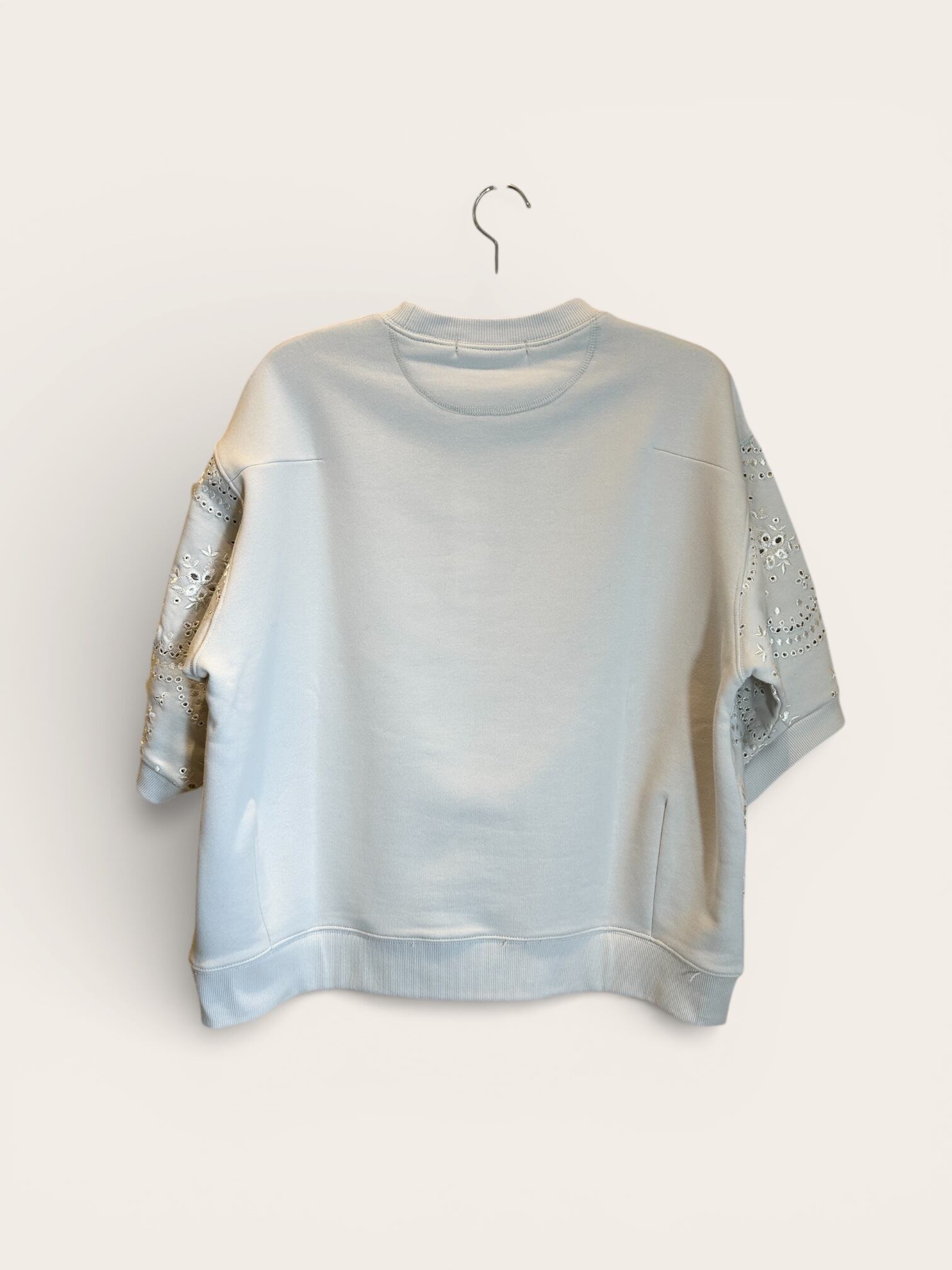 前身頃と両袖にレースをあしらい、カジュアルな裏毛にほどよい華やかさを添えています。