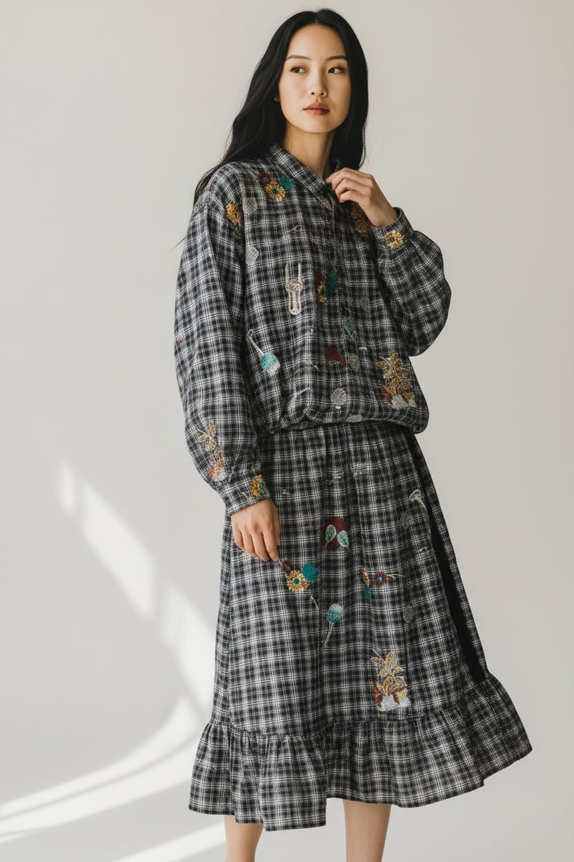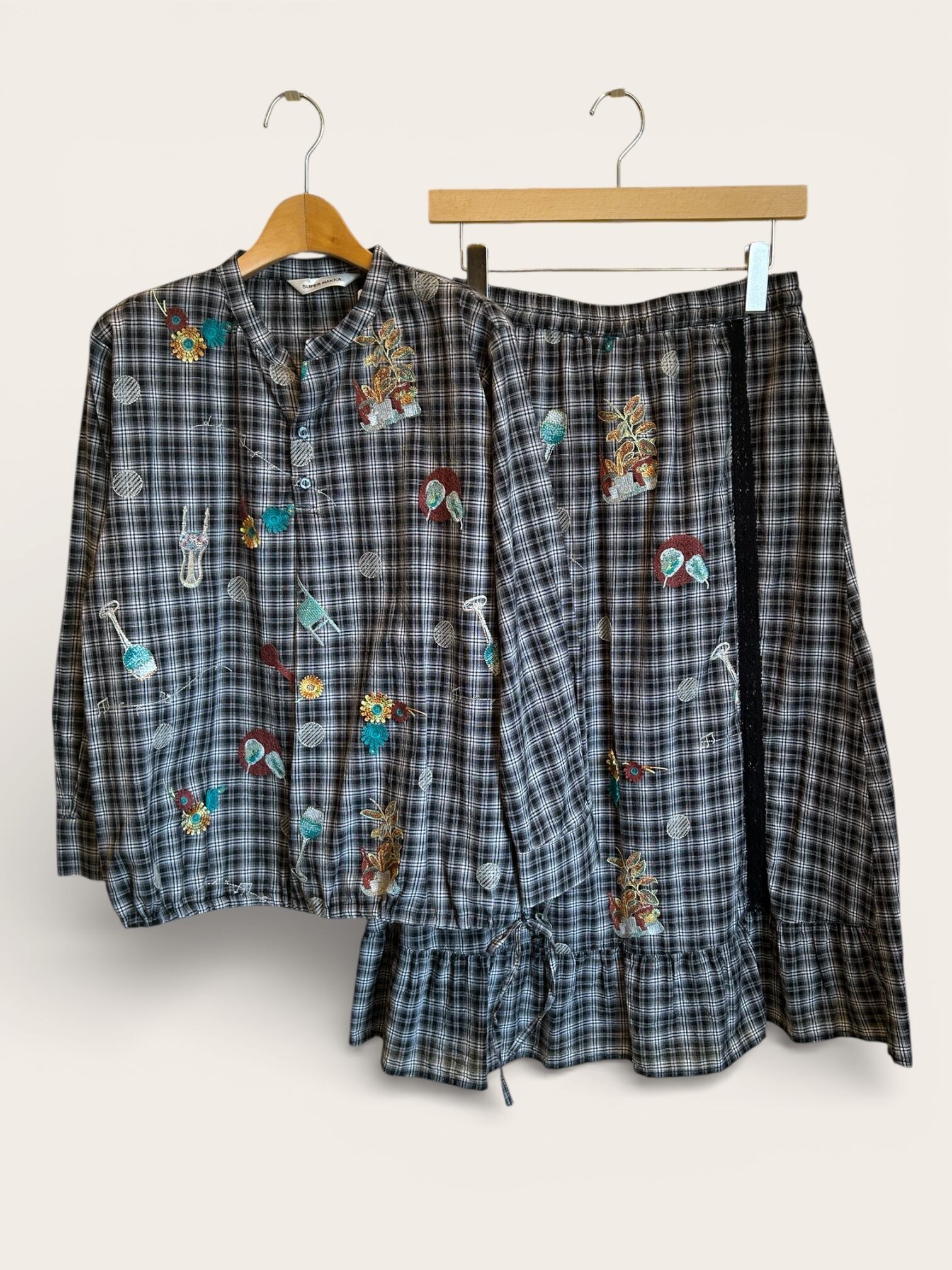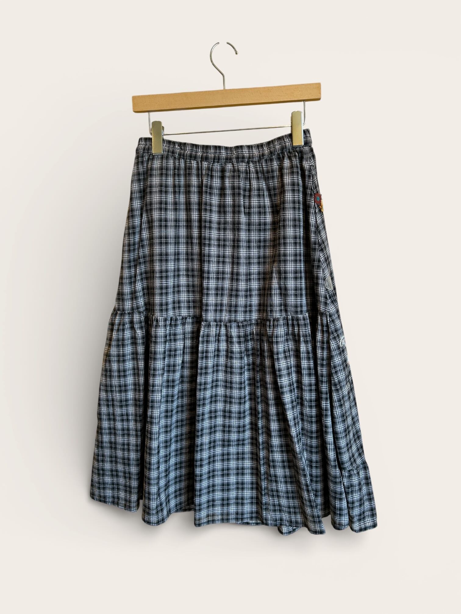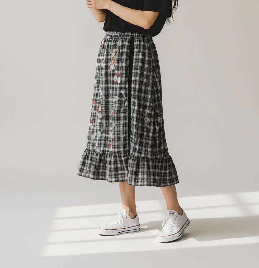 SUPER HAKKA|SUPER HAKKA×マツモトヨーコ 綿麻チェック「居心地のいい部屋で」オンケミ刺繍ティアードスカート(軽やかに揺れる)