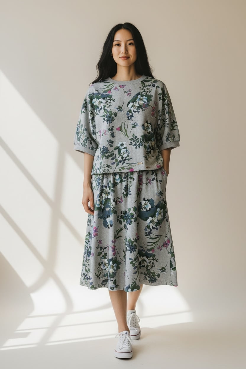 全体の色と柄が品よくまとまっていて“ちょうどいい抜け感”。