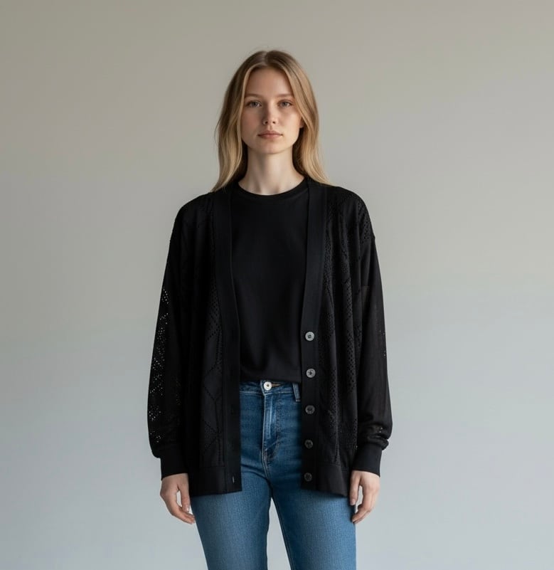 フロントにメッシュ生地をあしらった 軽やかカーディガン です。